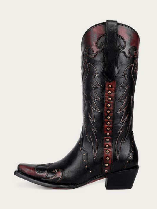 Black Snip-Toe Studded Rhinestone Classic Wide Mid Calf Cowgirl Boots