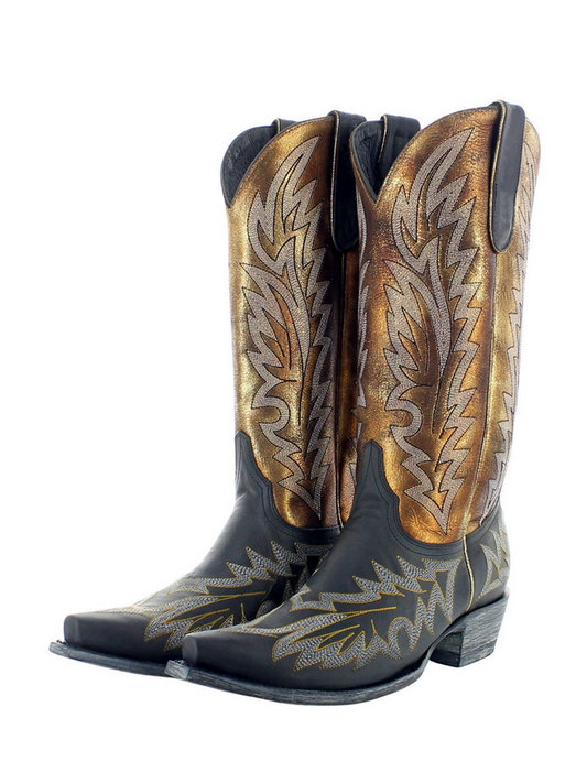 Contrast Black And Metallic Bronze Snip-Toe Embroidery Mid Calf Cowgirl Boots
