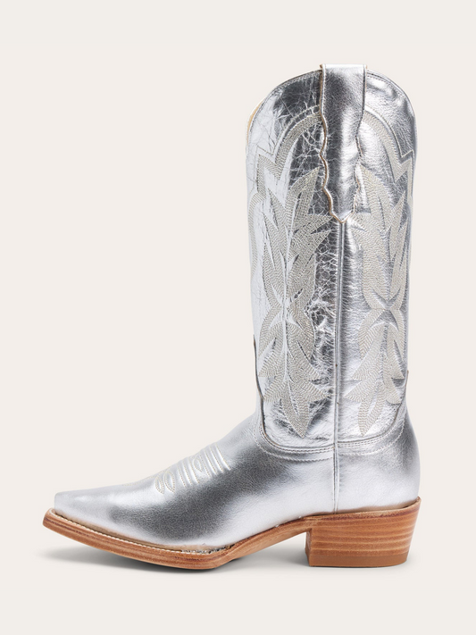 Metallic Silver Snip-Toe Classic Embroidery Mid Calf Cowgirl Boots