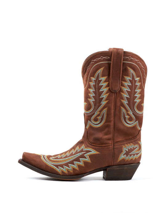 Brown Snip-Toe Colorful Filigree Embroidery Wide Mid Calf Cowgirl Boots