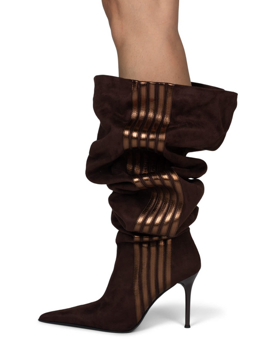 Brown Pointed-Toe Slouchy Wide Calf Over-The-Knee Stiletto Boots With Metallic Stripe