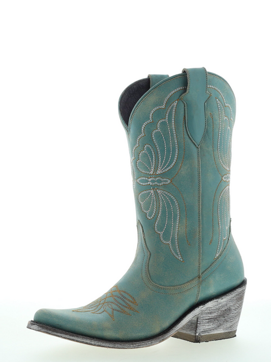 Butterfly Embroidery Almond-Toe Wide Mid Calf Cowgirl Boots - Aqua