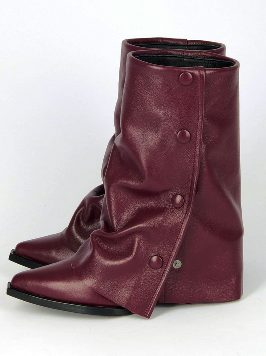 Burgundy Snip-Toe Fold-Over Snapped Panel Wide Mid Calf Boots