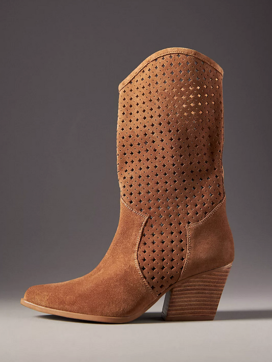 Brown Faux Suede Almond-Toe Hollow-Out Wide Mid Calf Cowgirl Boots