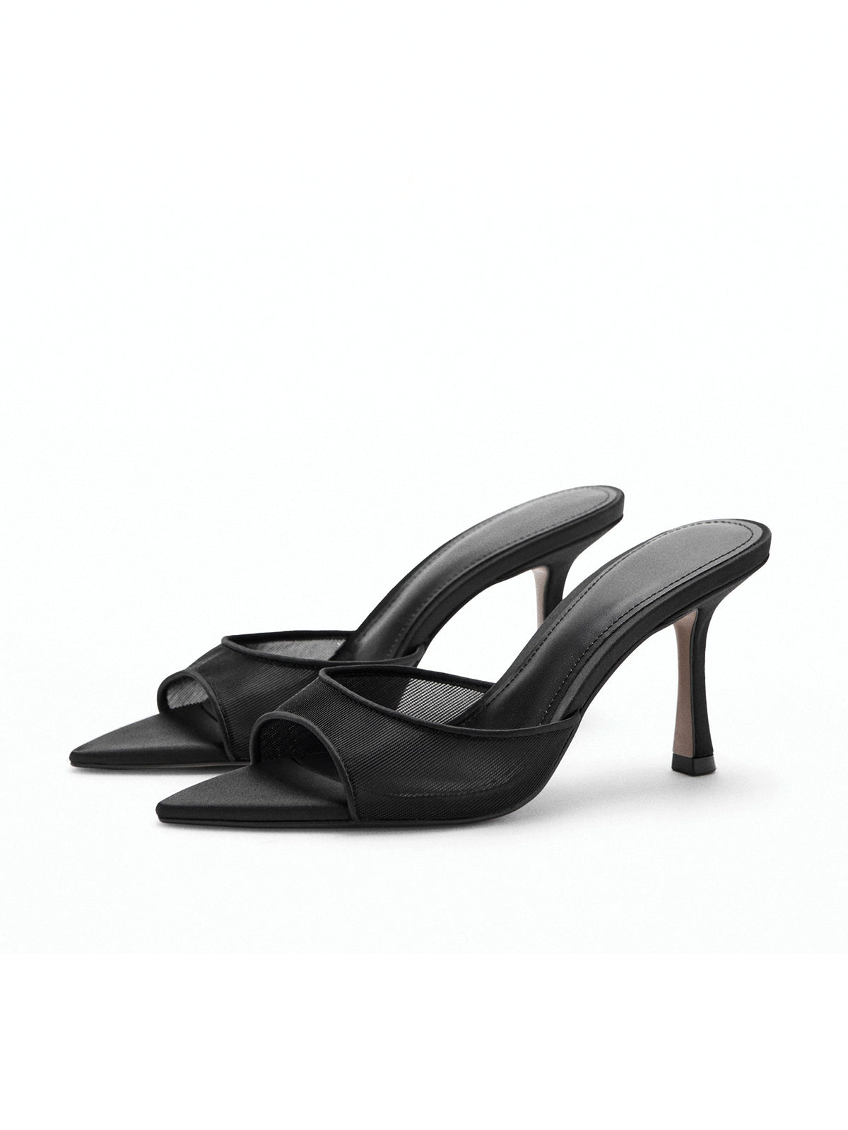 Black Mesh And Satin Pointed-Toe Simple High Heels Sandals