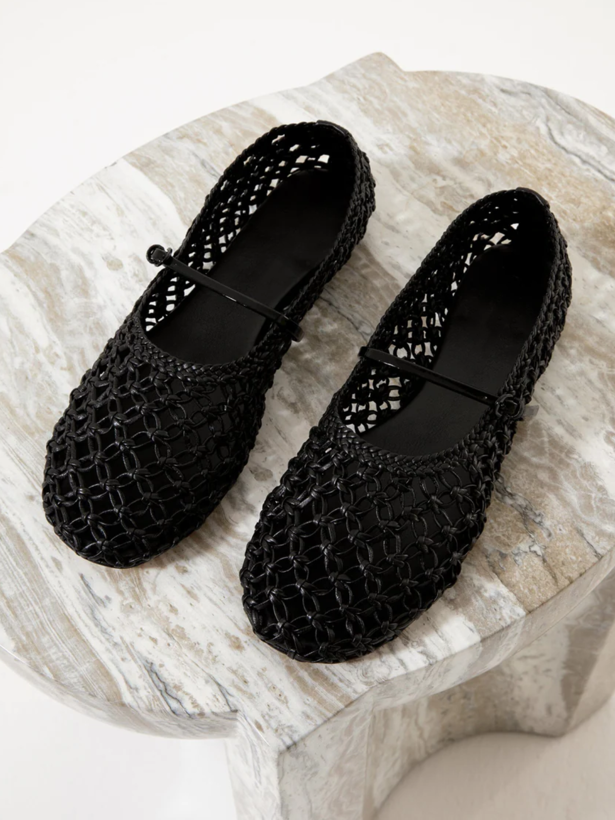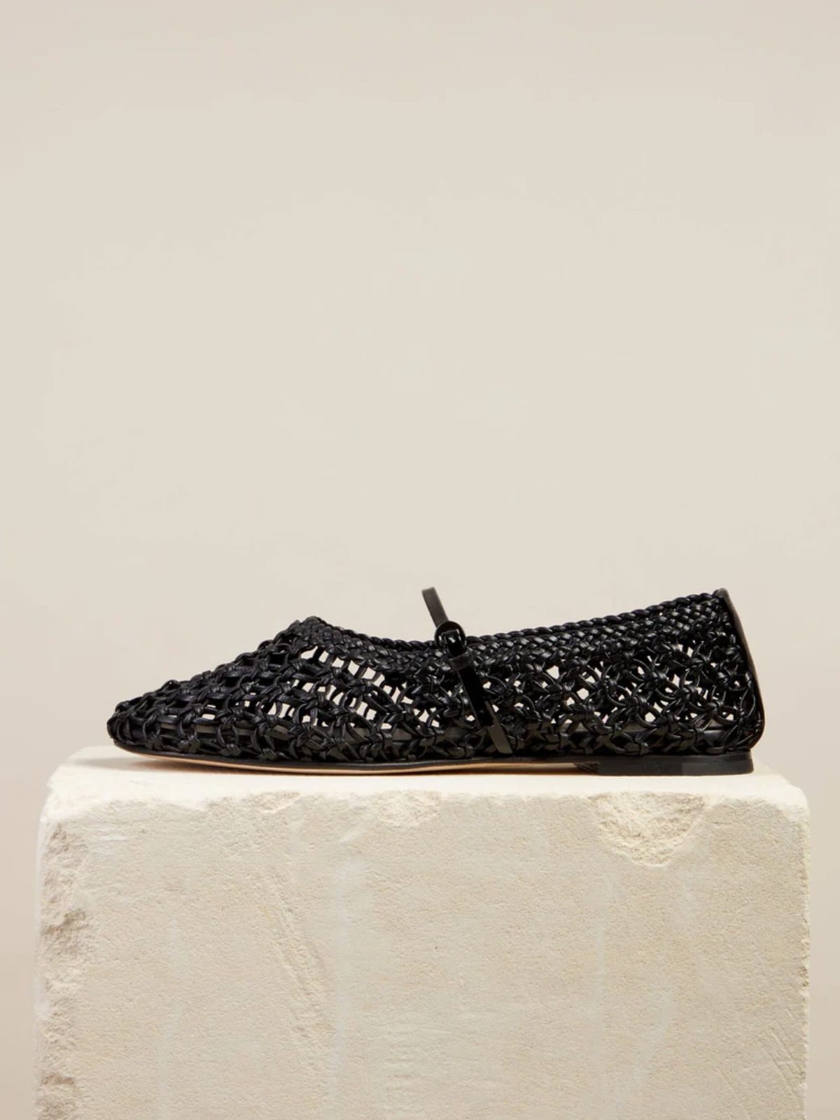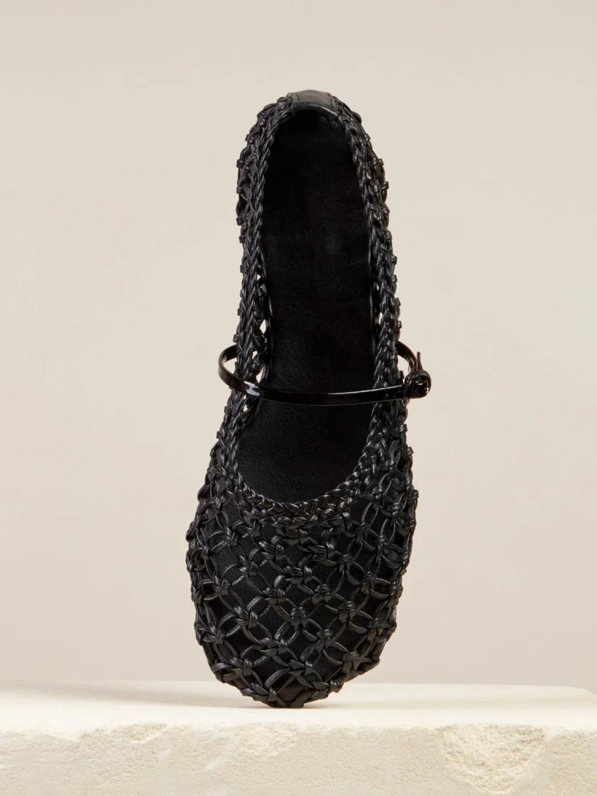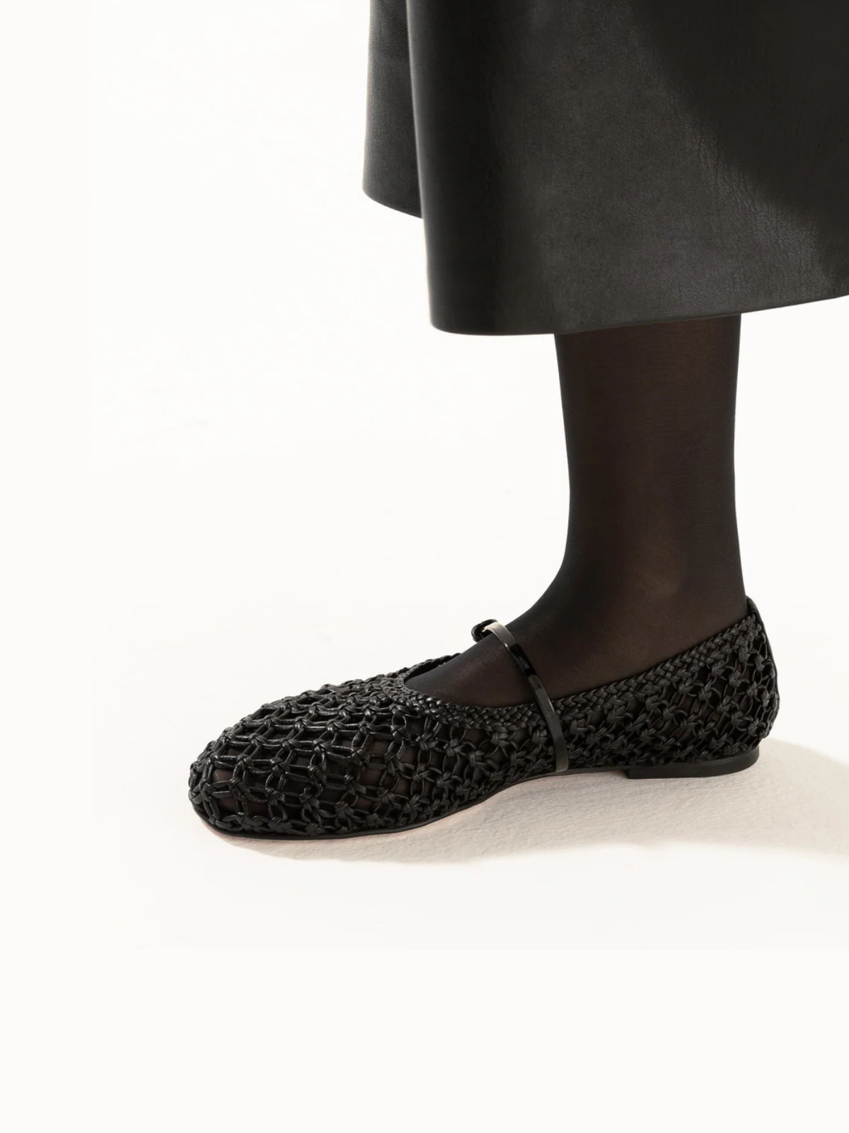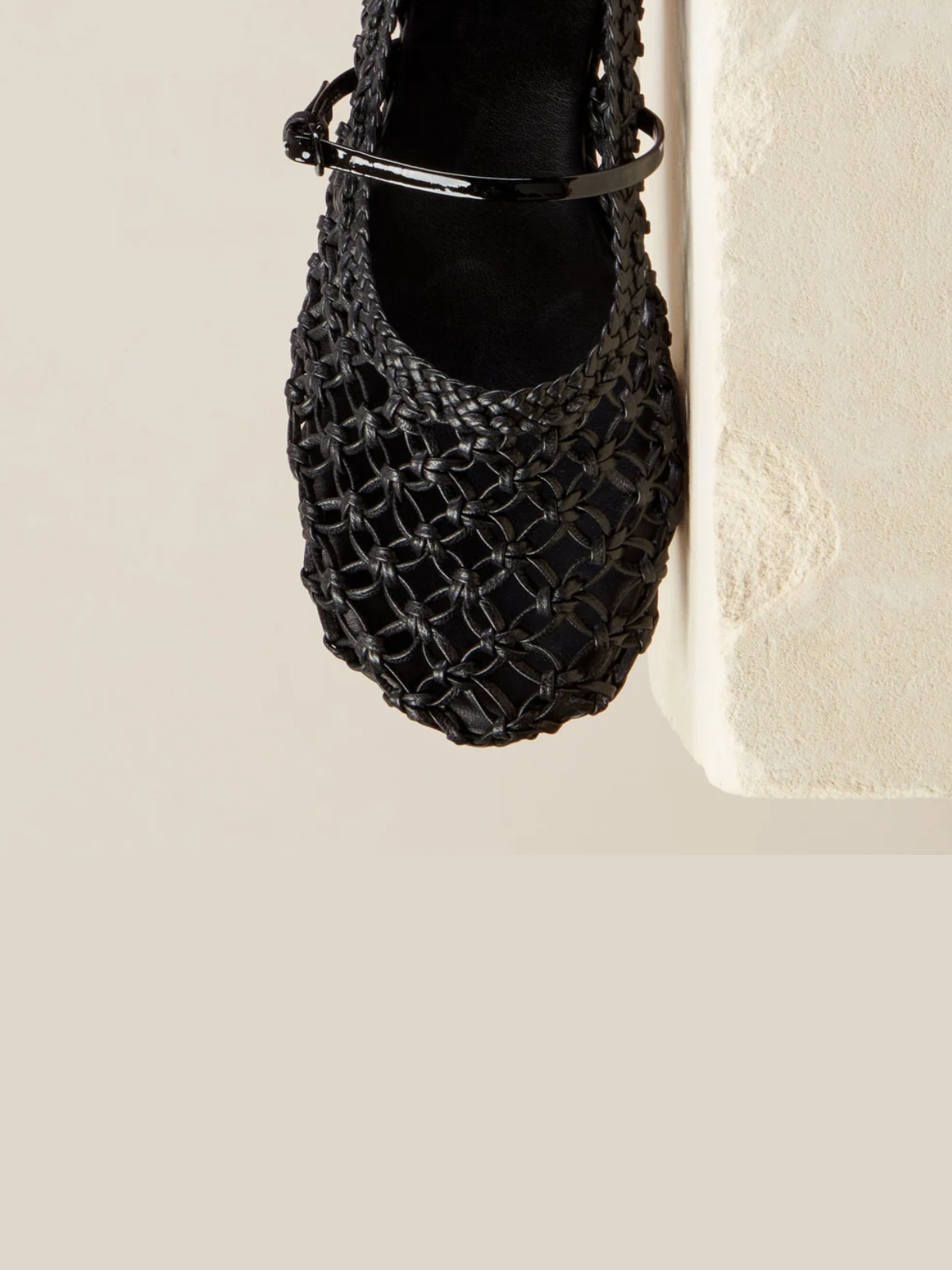 Super chic in black, these Mary Janes-style ballet flats feature a hand woven upper in vegan leather, accented with a thin buckled instep strap in patent vegan leather. Comfortable and stylish, they're perfect for any occasion, adding a touch of natural elegance to your look.