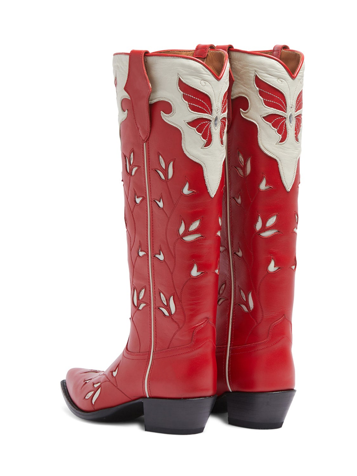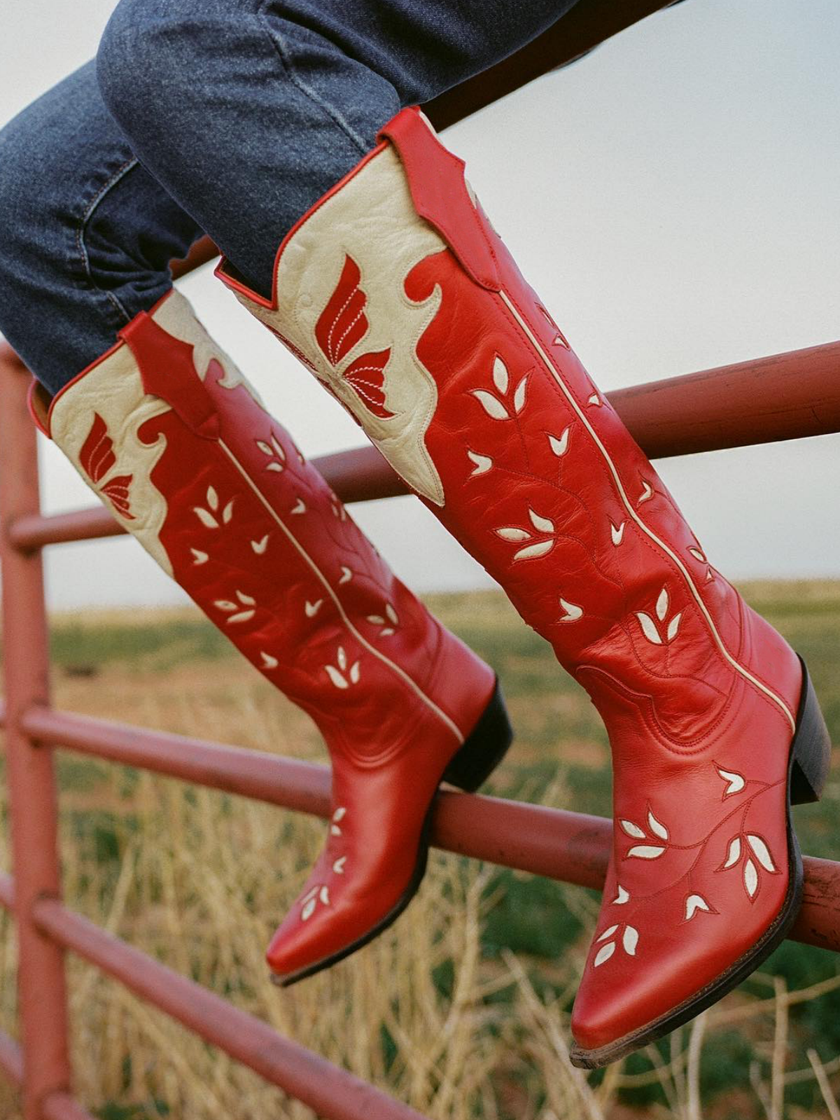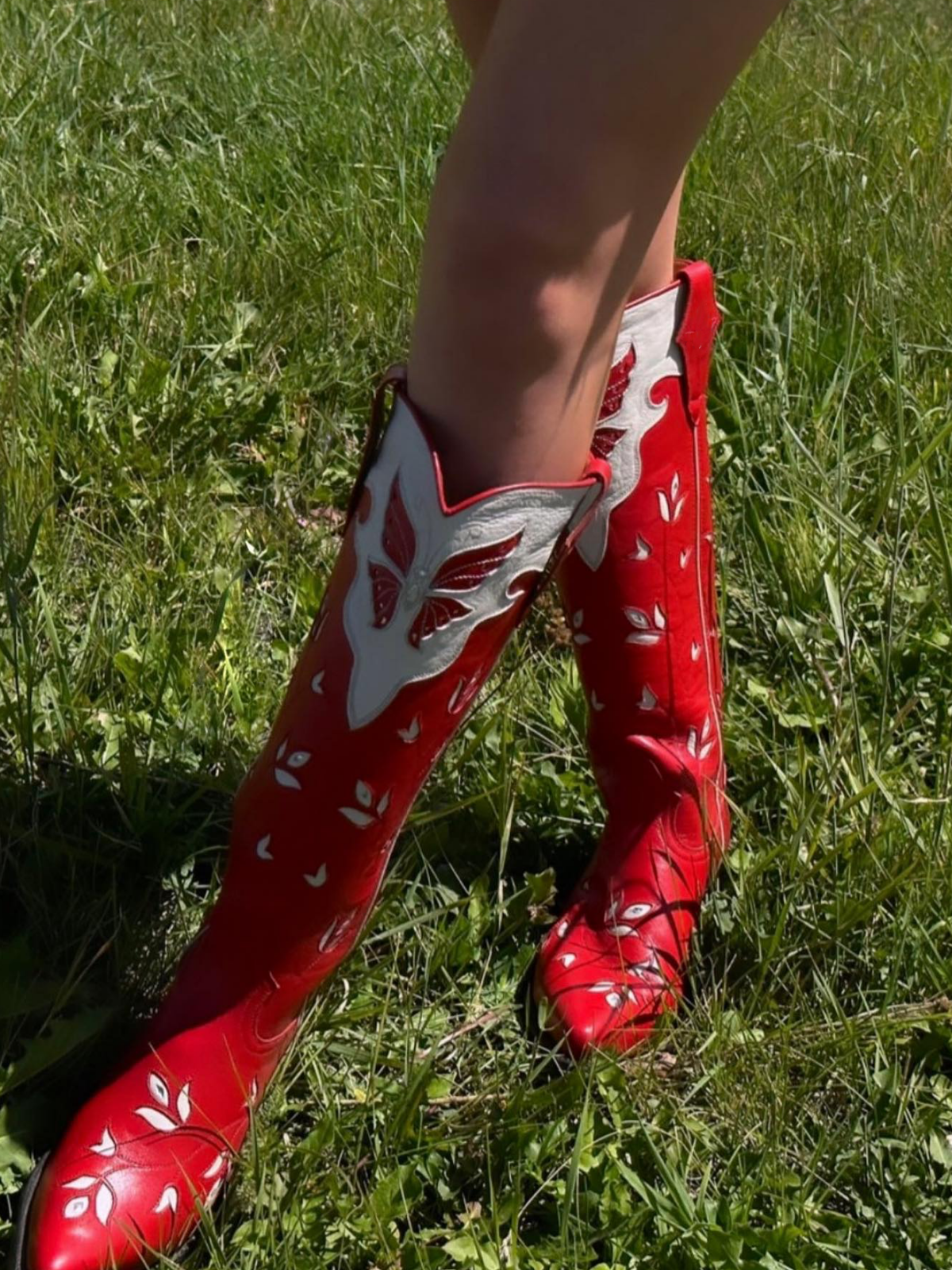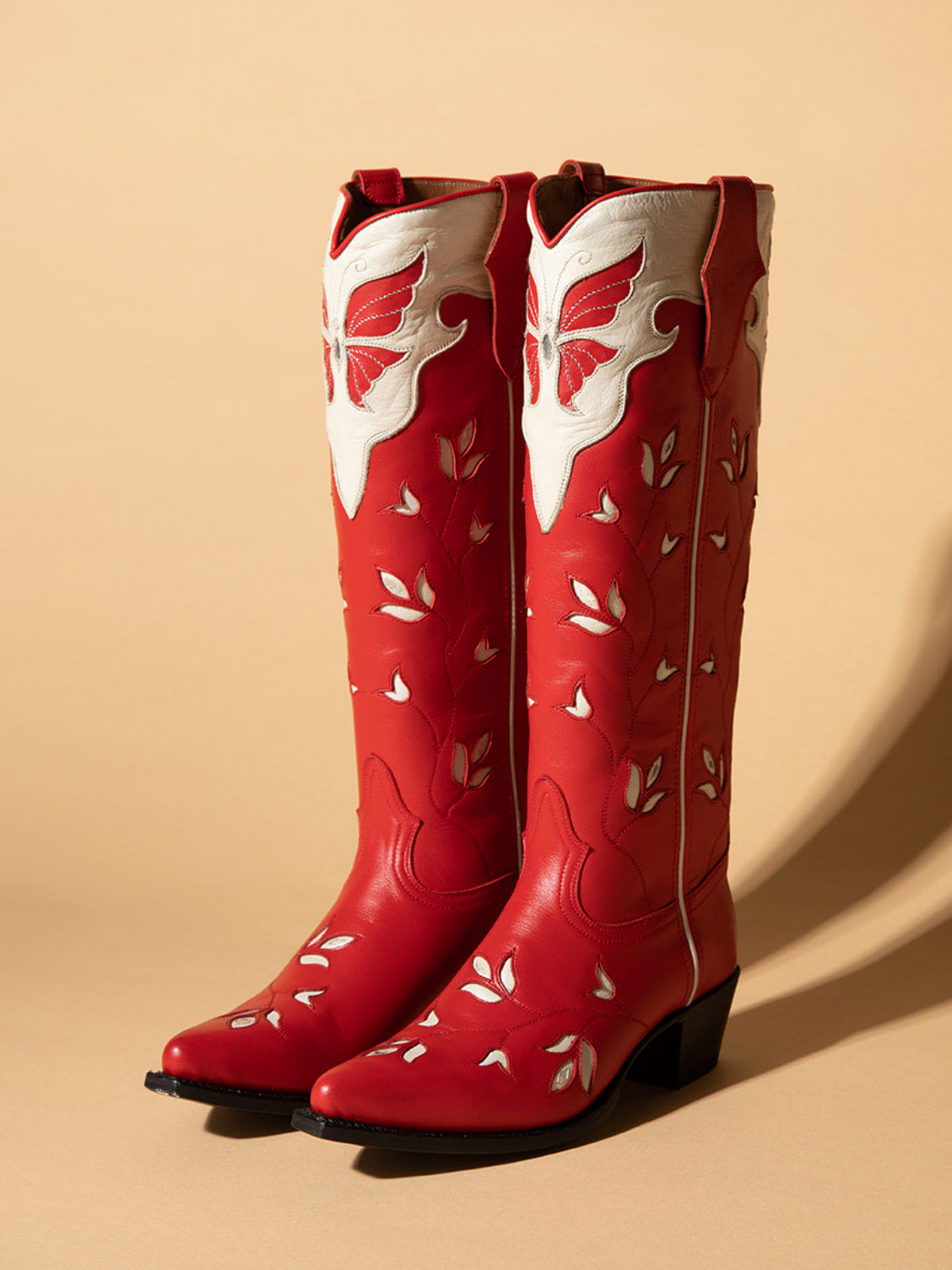 Step into a springtime sea of flowers and exude elegance with every stride in these cowgirl boots, where each step feels like a graceful butterfly in flight. The rich red vegan leather is beautifully complemented by intricate floral embroidery, while the butterfly accents add a touch of dreamy vitality to your walk. These boots infuse every path you tread with a stunning blend of charm and romance.