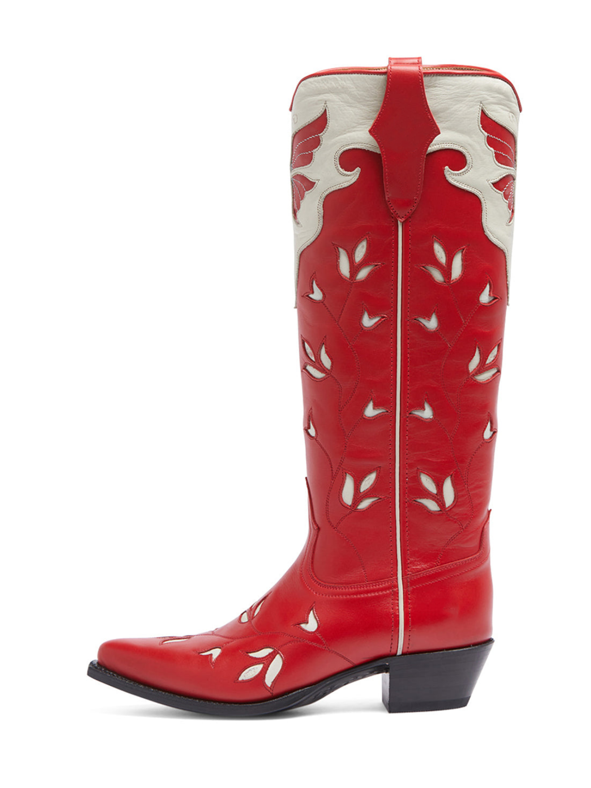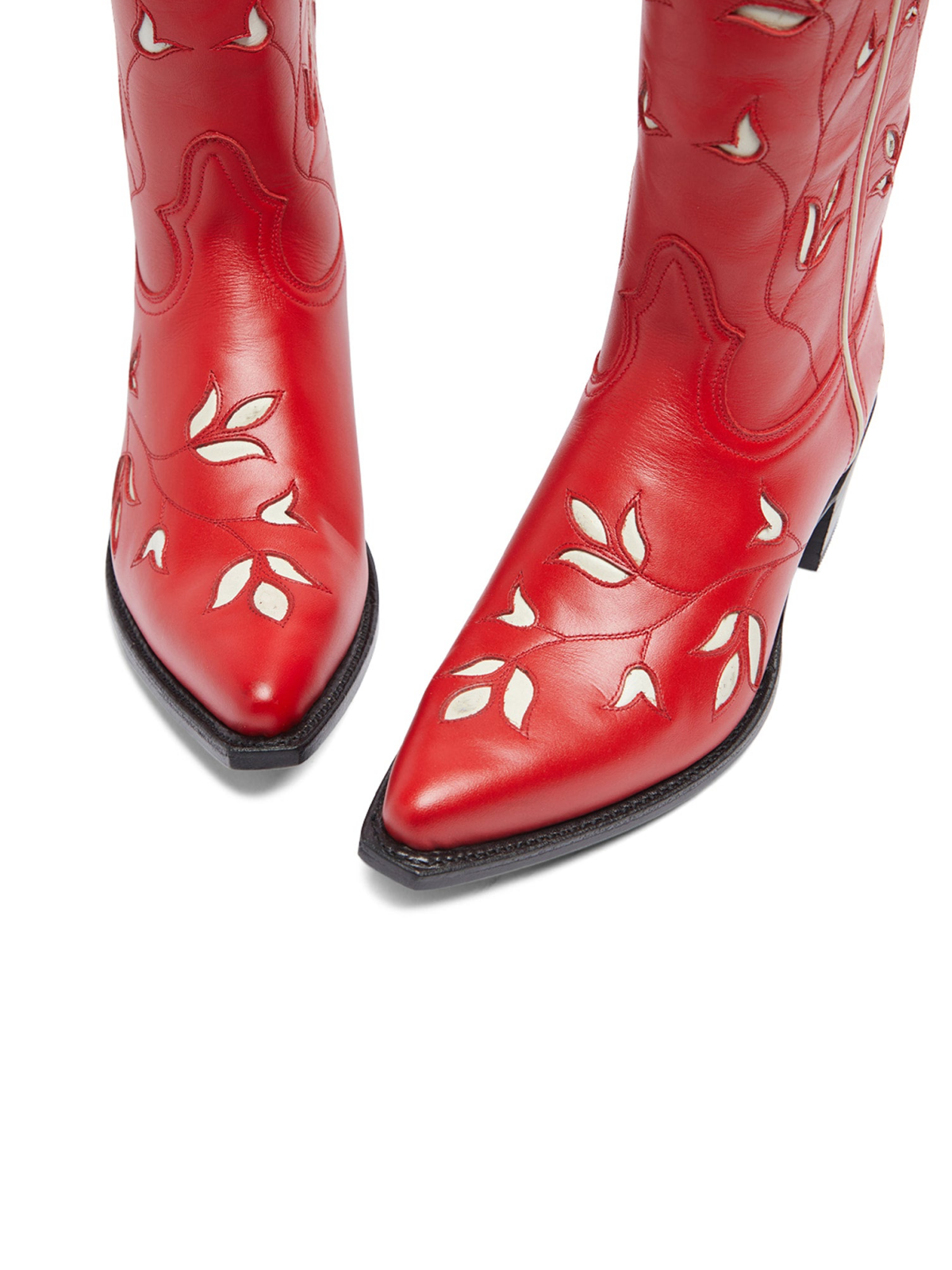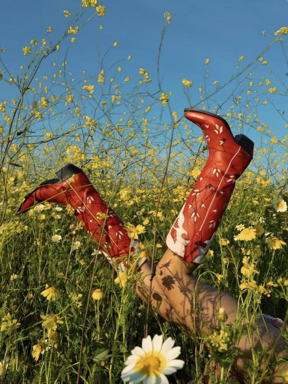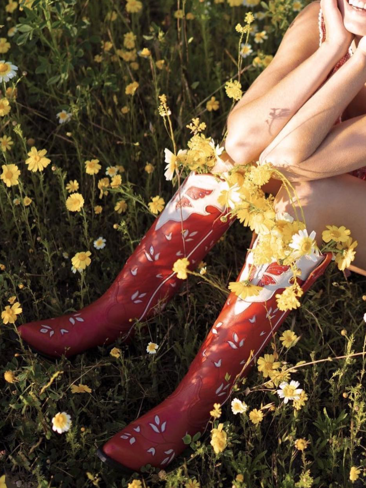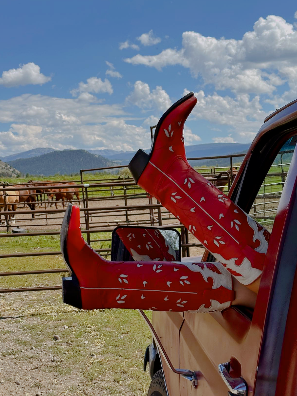 Step into a springtime sea of flowers and exude elegance with every stride in these cowgirl boots, where each step feels like a graceful butterfly in flight. The rich red vegan leather is beautifully complemented by intricate floral embroidery, while the butterfly accents add a touch of dreamy vitality to your walk. These boots infuse every path you tread with a stunning blend of charm and romance.