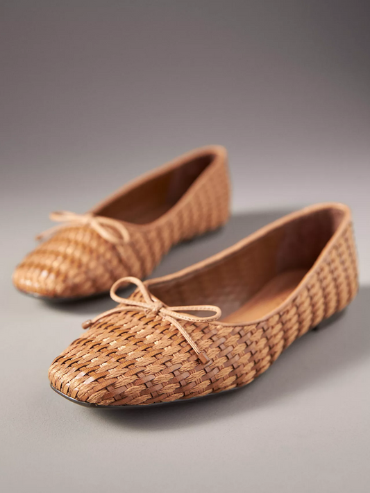 Brown Square-Toe Hand Knitting Woven Slingback Flats