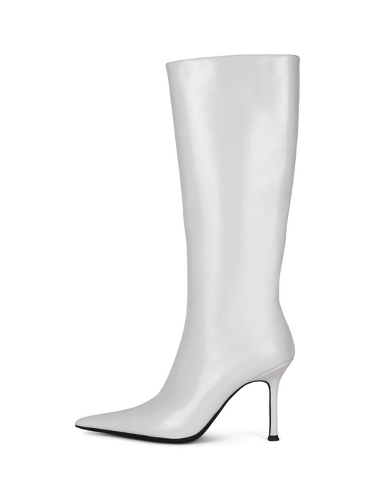 Ice White Full-Zip Pointed-Toe Mid Calf Stiletto Boots