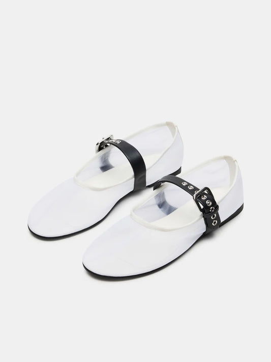 White Mesh Elongated Ballet Flats Mary Janes With Oversized Buckle