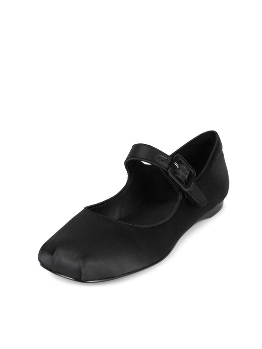 Black Satin Square-Toe Bridge Strap Ballet Flats With Bow