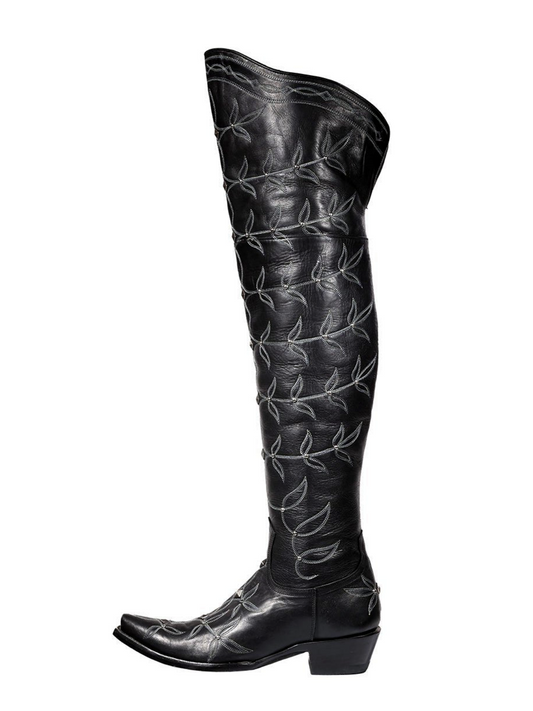 Black Snip-Toe Studded Leaf Embroidery Half-Zip Over-The-Knee Cowgirl Boots
