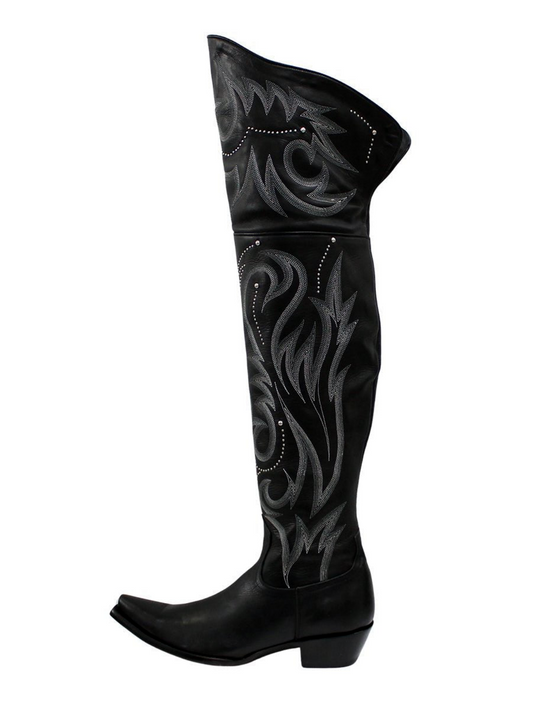 Black Snip-Toe Studded Embroidery Half-Zip Over-The-Knee Cowgirl Boots