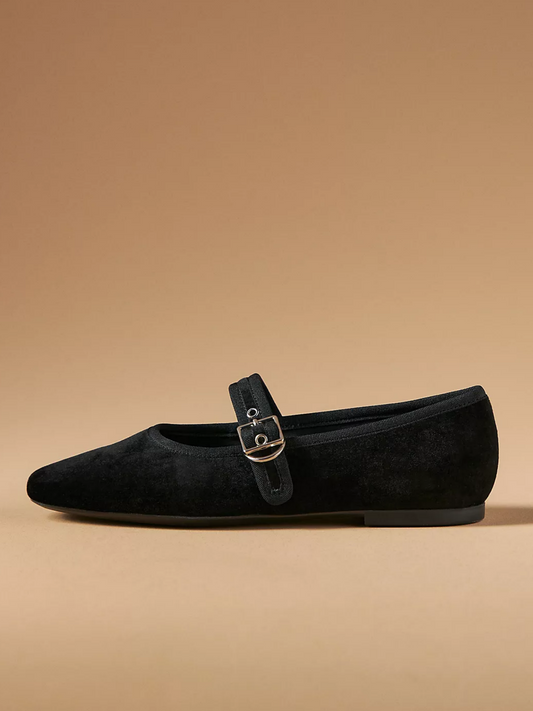 Black Velvet Square-Toe Classic Bridge Strap Ballet Flats