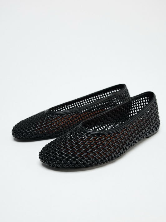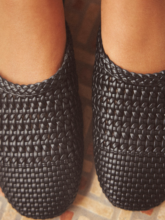 Black Woven Vegan Leather Round-Toe Slingback Ballet Flats