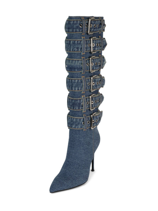 Blue Denim Pointed-Toe Silver Toe Full-Zip Tall Knee High Stiletto Boots With Buckle