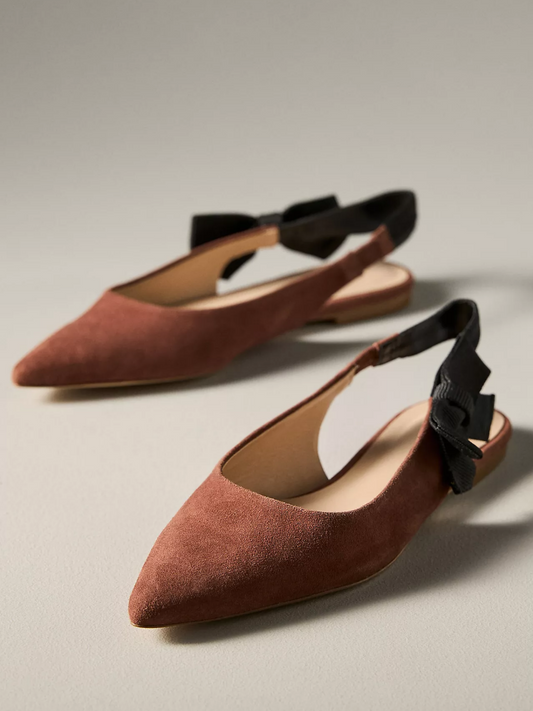 Brown Faux Suede Pointed-Toe Side-Bow Slingback Flats