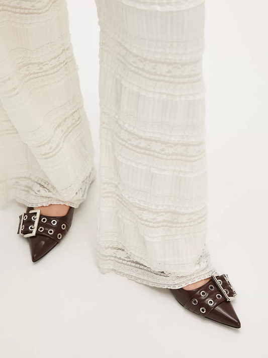 Brown Pointed-Toe Double Grommet-Buckle Straps Slingback Flats