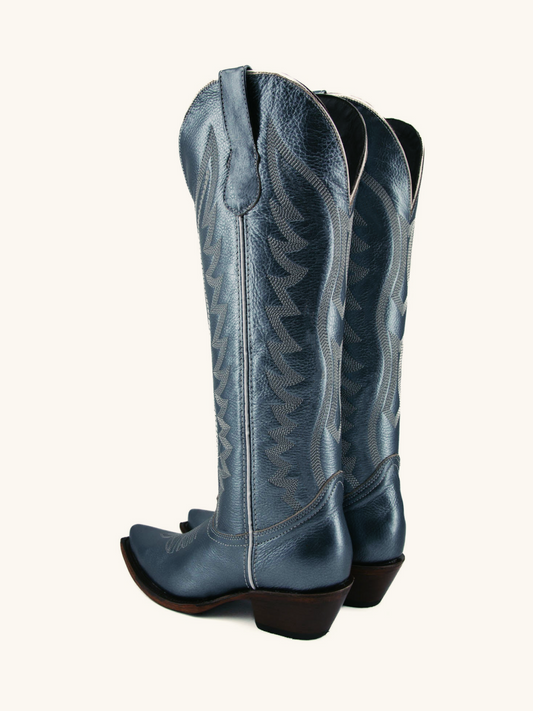 Metallic Navy Blue Embroidery Snip-Toe Wide Calf Western Cowgirl Tall Boots