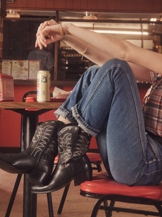 Black Almond-Toe Embroidery Inlay Wide Mid Calf Cowgirl Boots