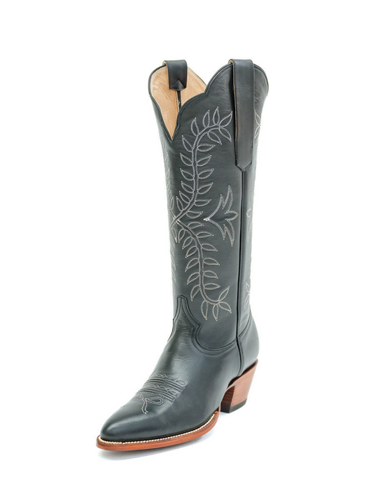 Black Almond-Toe Classic Leaves Embroidery Wide Knee High Cowgirl Boots