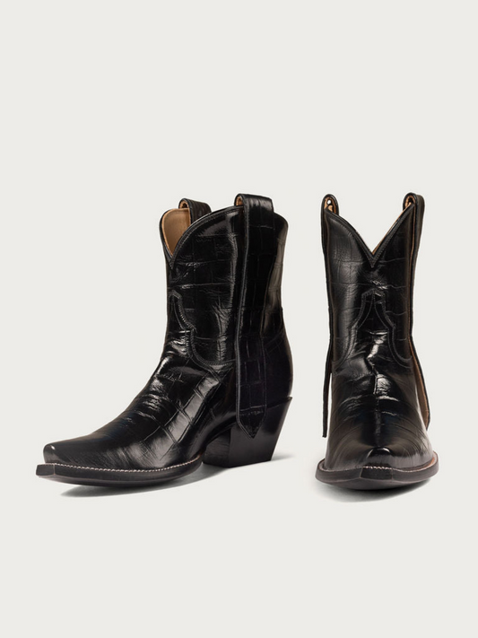 Black Crocodile-Embossed Snip-Toe Wide Mid Calf Cowgirl Boots