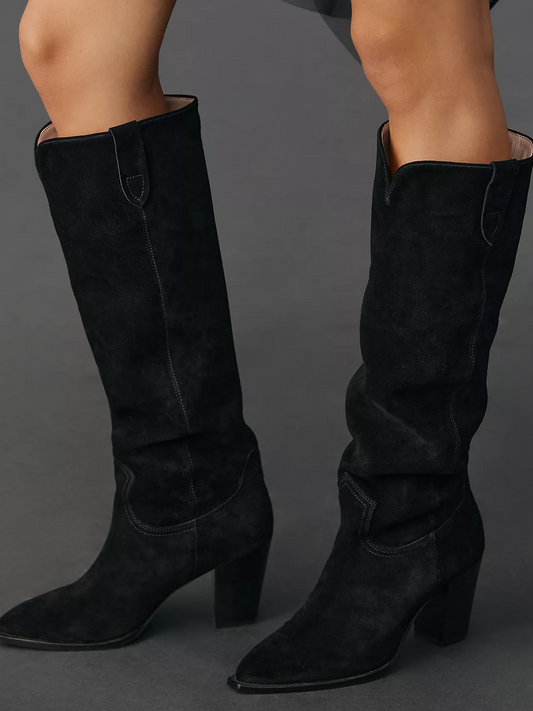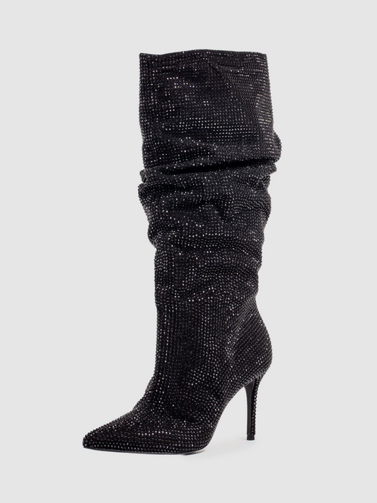 Black Faux Suede Pointed-Toe Crystal Slouchy Wide Mid Calf Stiletto Boots