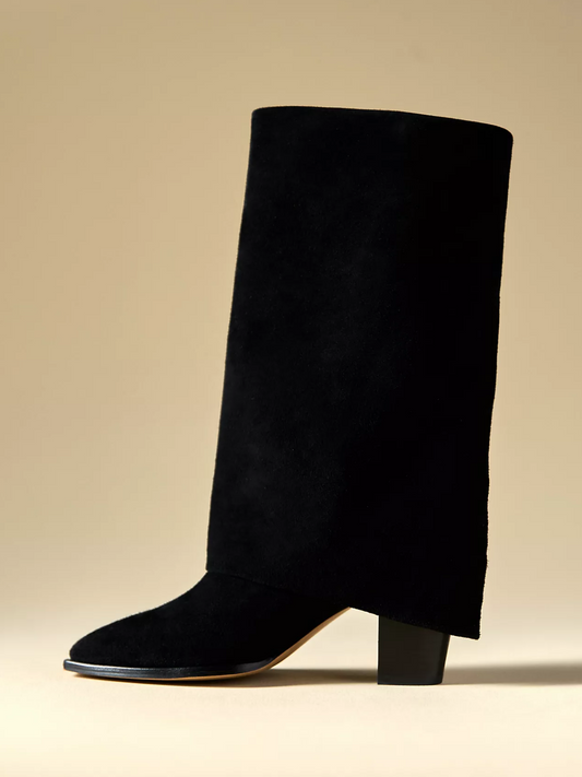Black Faux Suede Almond-Toe Fold-Over Mid Wide Calf Cowgirl Boots