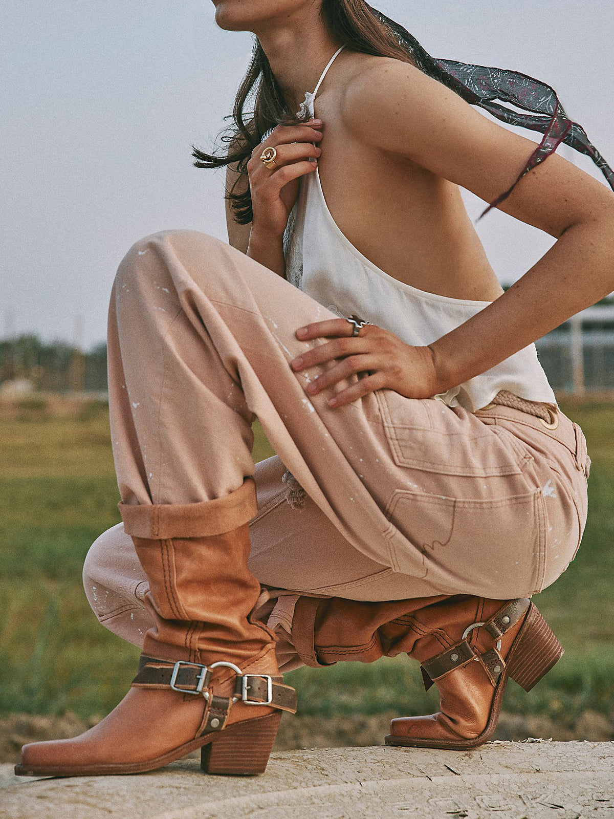 The boots feature a square-toe design, vegan leather material, and spur-inspired buckle details. With a mid-calf length, they are perfect for a cowgirl boot style. Ideal for those who love Western or country-inspired outfits.