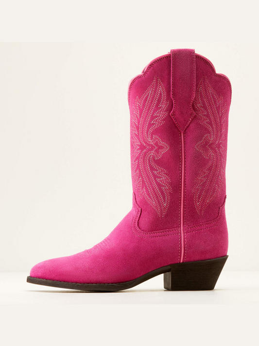 Pink Faux Suede Embroidery Almond-Toe Wide Mid Calf Cowgirl Boots