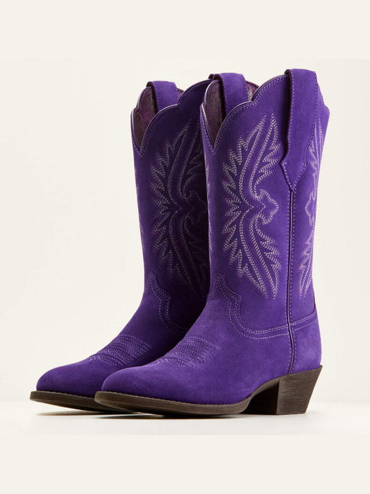 Violet Faux Suede Embroidery Almond-Toe Wide Mid Calf Cowgirl Boots