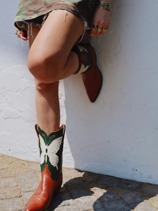 Contrast Brown And Green Pointed-Toe Wide Mid Calf Cowgirl Boots With White Butterfly Applique