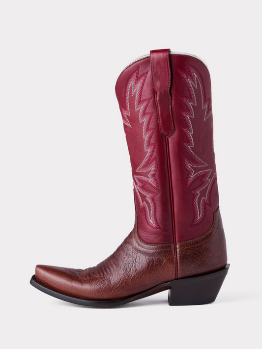 Contrast Chocolate And Red Snip-Toe Embroidery Mid Calf Cowgirl Boots