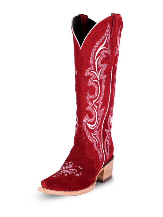 Red Faux Suede Snip-Toe Classic Embroidery Wide Mid Calf Tall Western Boots