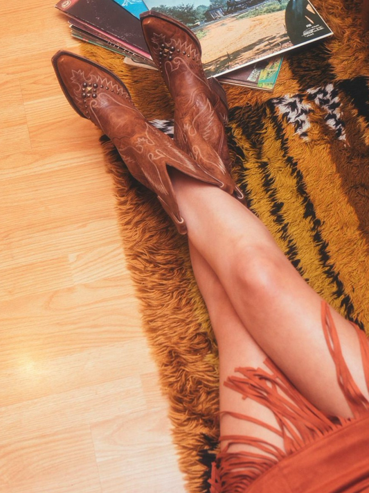 Distressed Brown Snip-Toe Studded Eagle Embroidery Mid Calf Tall Cowgirl Boots