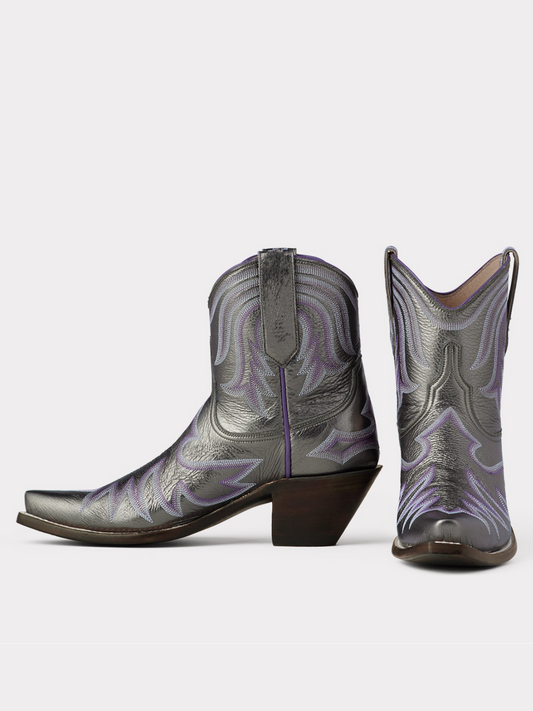 Metallic Pewter Snip-Toe Embroidery Wide Mid Calf Cowgirl Boots