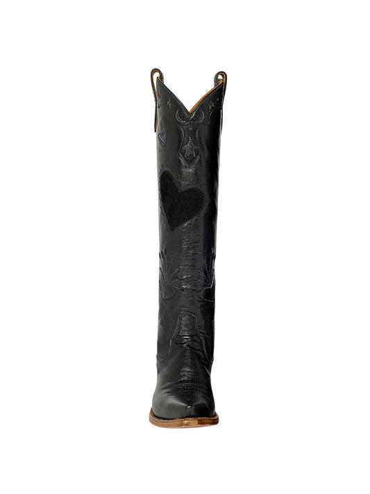 Black Snip-Toe Heart Applique And Inlay Wide Calf Knee High Cowgirl Boots