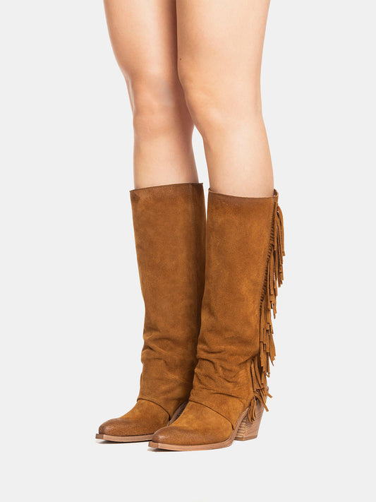 Brown Faux Suede Snip-Toe Side Fringe Wide Calf Knee High Cowgirl Boots
