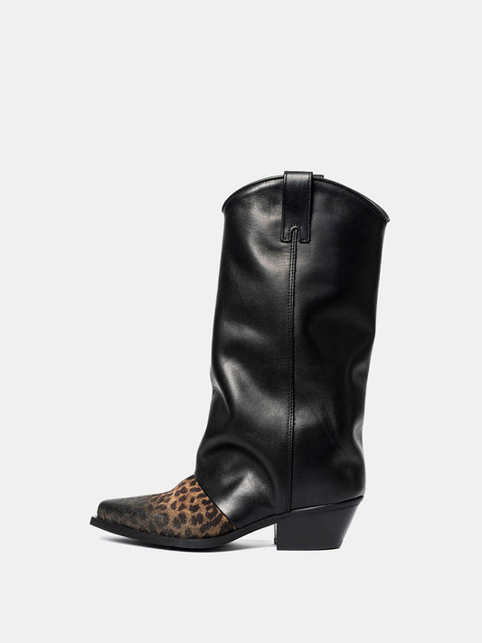 Contrast Black And Leopard Faux Suede Snip-Toe Simple Mid Calf Cowgirl Boots