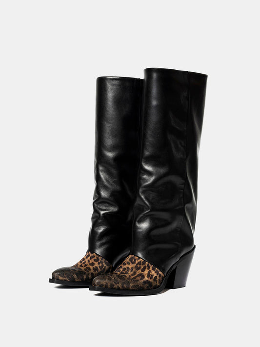 Contrast Black And Leopard Faux Suede Snip-Toe Wide Calf Knee High Cowgirl Boots