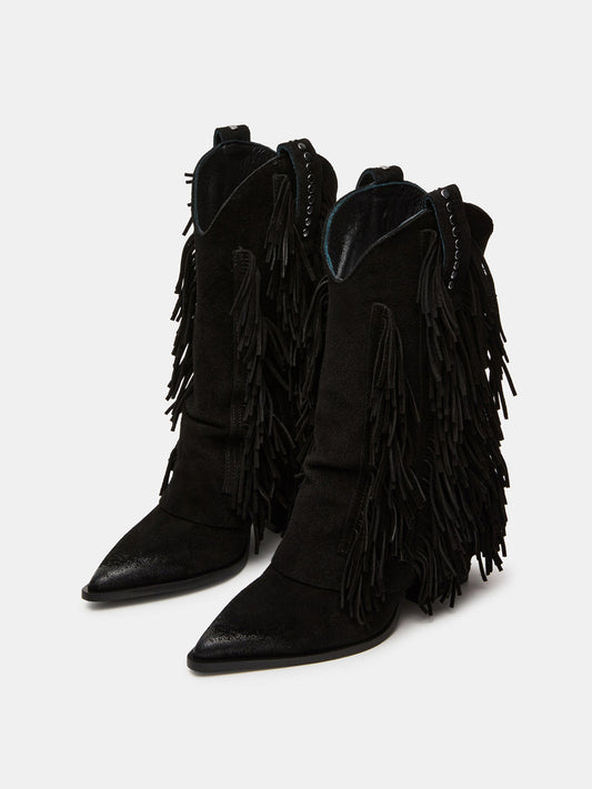 Black Faux Suede Pointed-Toe Full Fringe Fold-Over Mid Calf Cowgirl Boots