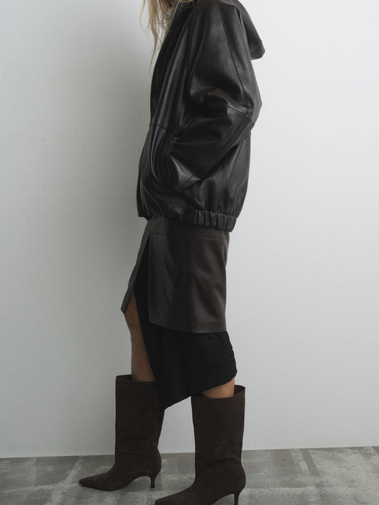 Chocolate Faux Suede Pointed-Toe Slip-On Mid Calf Stiletto Boots