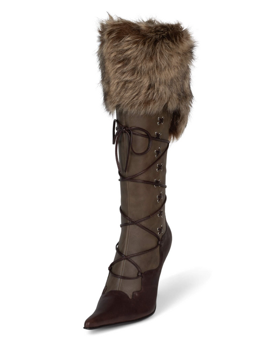 Contrast Black And Brown Full-Zip Mid Calf Stiletto Boots With Lace-Up And Plush Collar