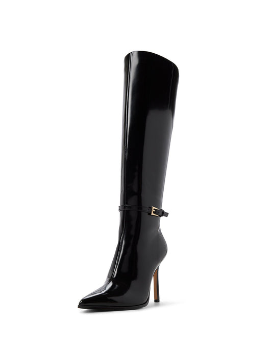 Patent Black Pointed-Toe Buckle Strap Full-Zip Knee High Stiletto Boots