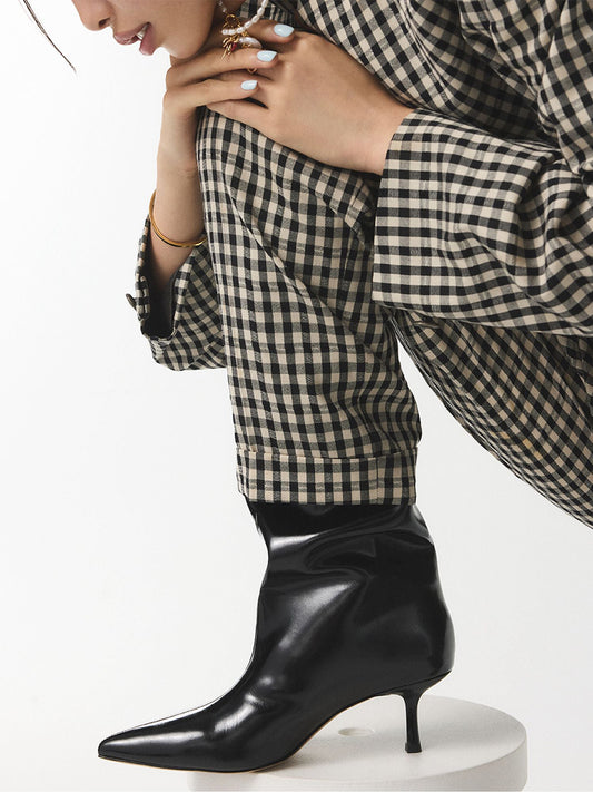 Patent Black Pointed-Toe Full-Zip Knee High Stiletto Boots With Metallic Gold Piping Spiral