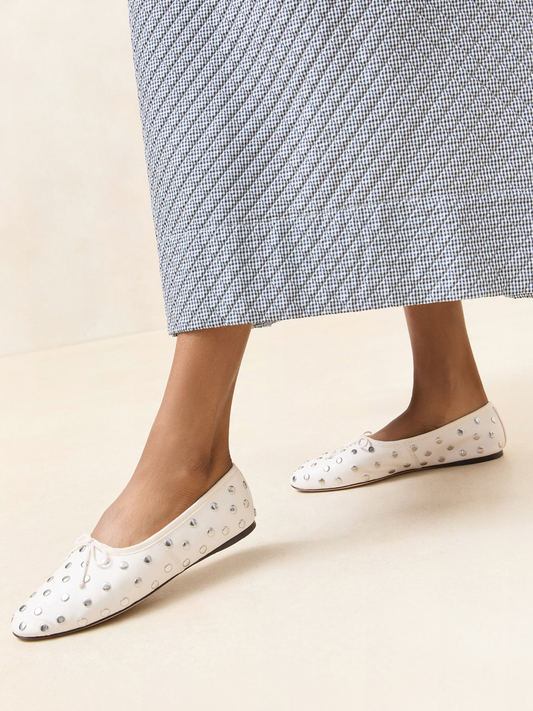 White Almond-Toe Bow Ballet Flats With Silver Studs