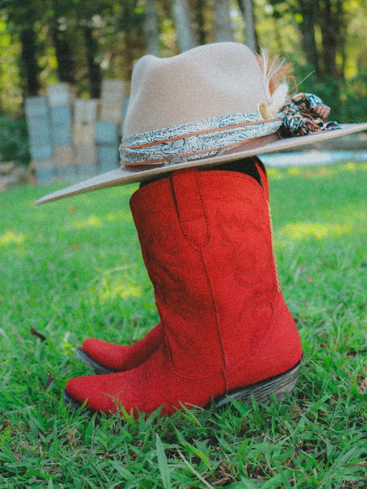 Red Almond-Toe Fallen Leaves Embroidery Wide Mid Calf Tall Cowgirl Boots