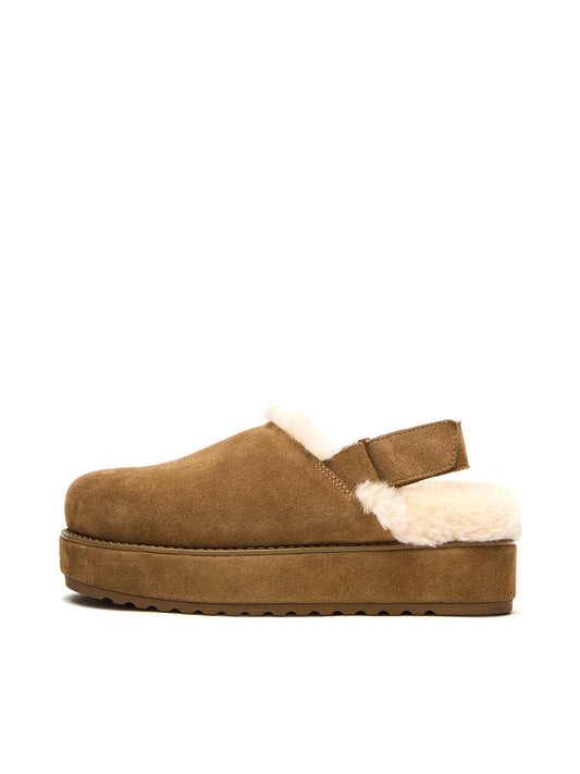 Cognac Faux Suede Round-Toe Slingback Platform Shoes With Faux Fur