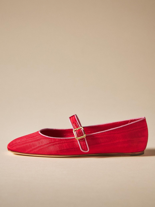 Red Satin Square-Toe Flats Mary Janes With Buckled Strap